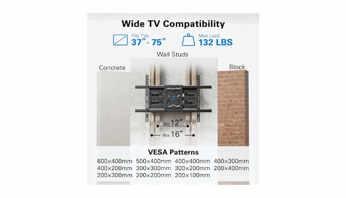 Universal TV Wall Mount: This PERLESMITH heavy-duty full motion TV mount fits most 37-75 inch flat/curved TVs with VESA 200x100mm to 600x400mm. The TV wall mount can be installed on 12″/16″ wood studs, solid concrete, or brick walls. Please do not mount on drywall alone.