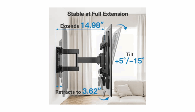 Space-Saving Dual Arm Design: Our wall mount TV bracket extends 14.98\" for immersive viewing, then retracts to just 3.62\" from the wall. The articulating arms on this full motion TV wall mount maximize space efficiency in multi-viewing areas.
