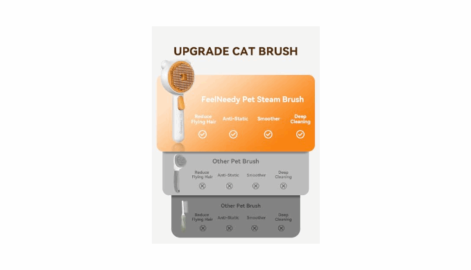BENEFITS OF THE STEAM BRUSH FOR CATS AND DOG:(Note: Our steam brush only converts water into mist, without a heating process.)① Reduces Flying Fur: Minimizes loose fur, keeping your home clean. Perfect for cat hair brush users, dog shedding, and indoor cats & dogs. ② Anti-Static: Moistens fur, preventing static for smoother grooming. Ideal for all long- and short-haired pets. ③ Deep Cleansing: Removes dirt and oils, leaving coats shiny. A must-have for cat grooming supplies. ④ Reduces Bathing Stress: Gentle steam cleaning for water-shy cats, minimizing stress. Great for dogs too