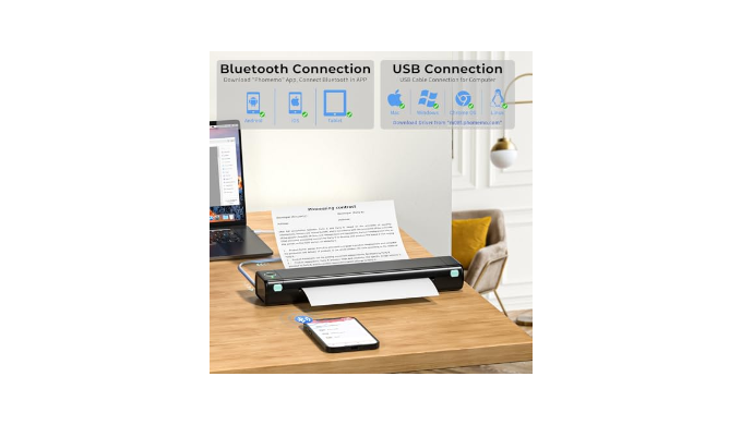 Bluetooth & USB Connection - The wireless printer can be connected to your Phone, Tablets via Bluetooth in the phomemo APP. You can also use our USB cable to connect for computer printing (PC printing needs to download the driver from: m08f.phomemo.com)