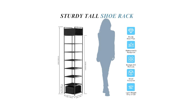 LIGHTWEIGHT & COMPACT NARROW SHOE SHELVES: Slim 6.7” x 6.7” footprint with 55” height—each unit weighs just 2 lbs for easy relocation. Ideal for apartments, RVs, or small spaces.