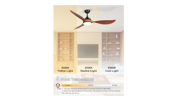 3 Color LED Light: Customize your lighting ceiling fan with 3 color temperature options—3000K yellow light, 4500K neutral light, and 6000K cold light—perfect for any room ambiance(not dimmable)