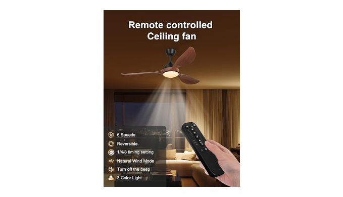 Remote Control Ceiling Fan: Effortlessly adjust wind speeds, lighting colors, and timers from anywhere in the room with the handheld remote control, providing ultimate convenience