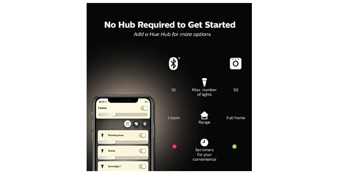 New to smart lighting? Get started with easy smart lighting with this Hue smart bulb. Just using Bluetooth, without the Hue Hub, you can control up to 10 lights in 1 room. Comfy on the couch? No need to get up to change your lights. Control your lights using the free Hue Bluetooth app or with just your voice with Alexa or Google Assistant.
