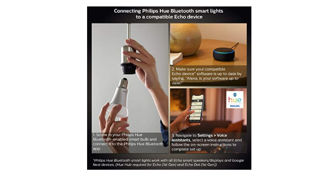 - Control lights with your voice: Easily connect your Philips Hue Bluetooth smart lighting directly with your voice using Alexa or Google Assistant. Works with all Echo smart speakers/displays and Google Nest devices, (Hue Hub required for Echo (1st Gen) and Echo Dot (1st Gen)). For the full Hue experience purchase the Philips Hue Hub (sold separately).