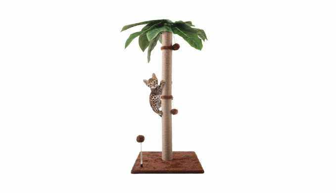 TROPICAL ADVENTURE FOR YOUR CAT:Turn your living room into a feline paradise with this nature-inspired cat scratching post. Designed to mimic the feel of a real tree, it features hanging spring balls and a vertical trunk that tap into your cat’s natural urge to climb, scratch, and play. It\\\'s a must-have for curious cats who love a good stretch and scratch
