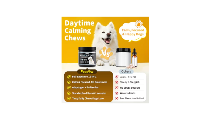 Dog Calming Chews with 12-in-1 Formula: POPPAW calming chews for dogs and puppies 12+ weeks combine Valerian Root, Chamomile, Ashwagandha, GABA, and L-Theanine for daily relaxation, focus, and behavior support. Gentle herbal care works best with consistent, long-term use.