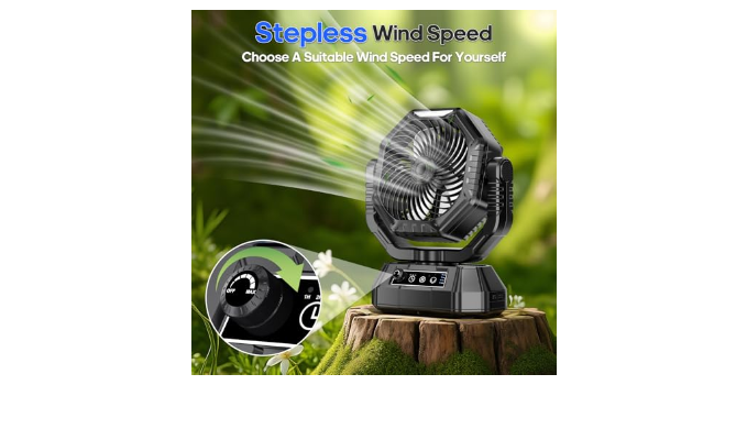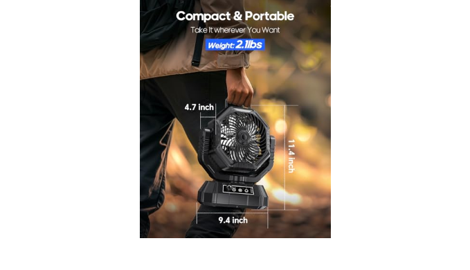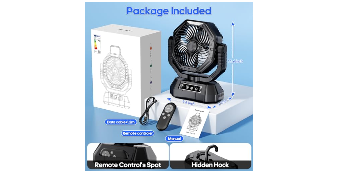 【Versatile Indoor & Outdoor Use】This rechargeable fan portable is portable, tabletop & hangable. This Cordless camping fan comes with a handle for easy portability; There is a hidden folding hook at the bottom of the portable fan, it can be hung on tents, branches, parasols, RVs, and hammocks. You can also put our portable fan for travel on the desktop at home or office as a desk fan. Of course, if you want to install our battery fan on the wall, there is an invisible hook hole at the bottom of the fan to meet your needs.