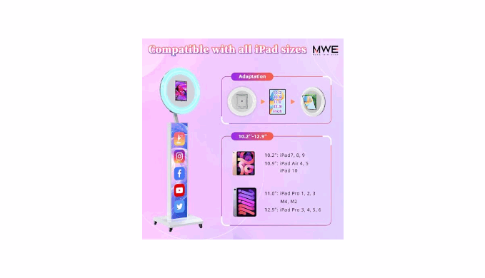 [Compatible with any iPad] Two photo booth panels will be sent in the package for compatibility with ipad 10.2in(ipad model: iPad7-9)/10.9in(iPad model: iPad air4,5,ipad 10)/11in(iPad model: iPad pro1-3,M4,M2)/12.9in(ipad Model: ipad pro3-6) and so on all sizes, just unscrew the photo booth panel can be easily replaced, if the latest models of tablets do not fit, please contact us to customize the panel