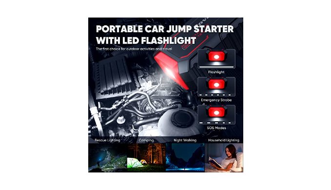 【More than car jump starter】: The A30 jump starter battery pack can also be used as 74 Wh power bank with 2 usb outports to charge your smartphone, or other USB devices at the same time.The 400 lumen built-in LED light with 3 modes: Flashlight, Strobe, and SOS, which is helpful in t dark or in emergency.