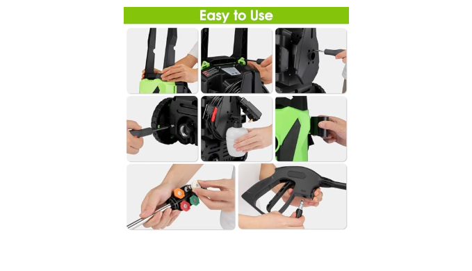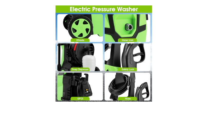 ✓ More durable & Maximum safety: Our electric power washer features safety automatic total stop system (TSS), which automatically shuts off the pump when trigger is not engaged to save energy and prolong pump life. The spray gun has a safety lock which is safer and more reliable. The unique plug-in spray gun makes it more convenient.This pressure washer is IPX5 waterproof and features a GFCI plug to prevent electric leakage, allowing you to safely operate this machine without any safety concerns