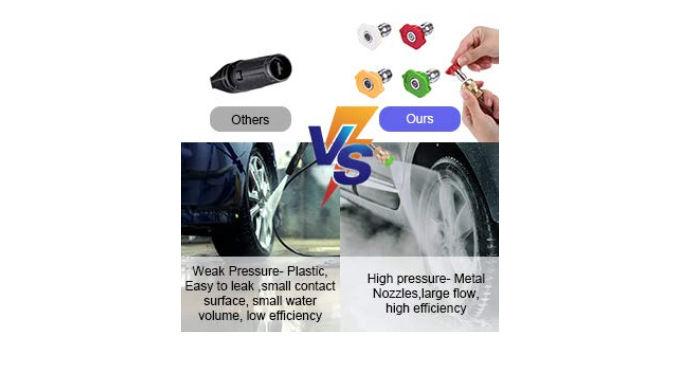 ✓ 4 NOZZLES OPTIONS - 4 Quick-Connect spray tips (0º, 15º, 25º, 40º and soap) tackle light,medium and heavy duty cleaning tasks.0º - areas that are high and hard to reach; clean crevices in sidewalks or driveways; 15º- use on concrete, brick and other hard surfaces with stubborn stains; 25º- use on painted surfaces, wood siding, fences and lawn mowers;40º- use on windows and screens;soap- use to spray soaps and detergents