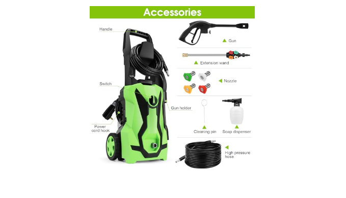 ✓ EASY TO INSTALL & MOVE & STORE : The high quality Copper Connections are Easily Joined to Hose and Nozzle for Quick, Effortless Hookup, water no leak.Compact, upright design with axle mounted wheels allows easy roll-away mobility. Pistol style grip with trigger spray wand dispenses for efficient pressure washing.Provides a stronger aluminum handle. The built-in storage box of the high pressure cleaner can store all accessories neatly, and keep the power cord clean and tangle-free.