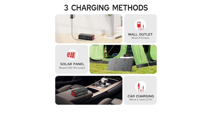 Three Charging Ways: Powkey portable battery power station can be recharged by Home wall AC Outlet(DC 5521 input 15V/2A max). 12V cigarette lighter Adapter. Also It can Become Portable Solar Generator. (solar panel not included,required 13V-16V output).