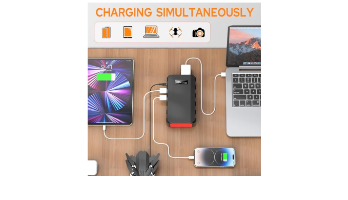 Universal Charger: Our product includes QC3.0 9v/2A and 5V/3A two USB outputs, one 110V AC outlet, one DC 9~12.6V/10A (Max) output, which means this charger can power your multiple devices at once. It can charge your iPhone and Galaxy up to 8 times, or 2 times for your 12\'\' Macbook.