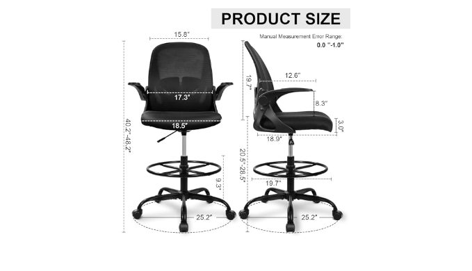 Adjustable Drafting Chair:This high rotary drawing chair has a foot stool with adjustable height, and the 90 degree overturned armrest design can save a certain amount of space, which is very suitable for standing desks, sitting desks and bars; Equipped with a round foot ring can help you move your feet more frequently, reduce the pressure on the back of your legs and improve comfort.
