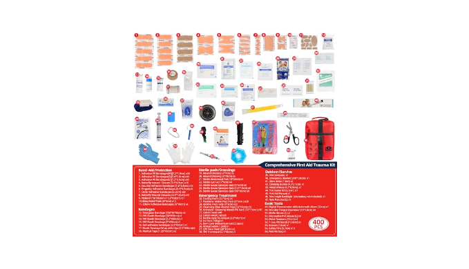 Survival Emergency Care: The 400-piece comprehensive emergency kit includes basic emergency supplies such as various bandages, gauze, disinfectant wipes, and survival tools such as flashlights and flints, providing comprehensive first aid protection for your outdoor travel
