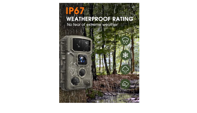 【IP67 Waterproof】With a bottom-opening battery compartment, Punvoe wildlife camera is IP67 waterproof, guarding against rain intrusion. Enjoy features like time stamping, customized monitor periods, password protection, loop recording, and more for enhanced functionality and security.