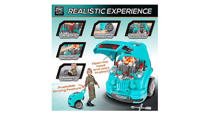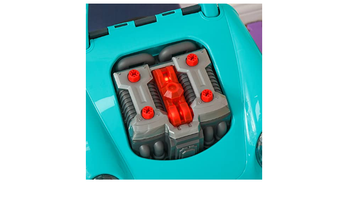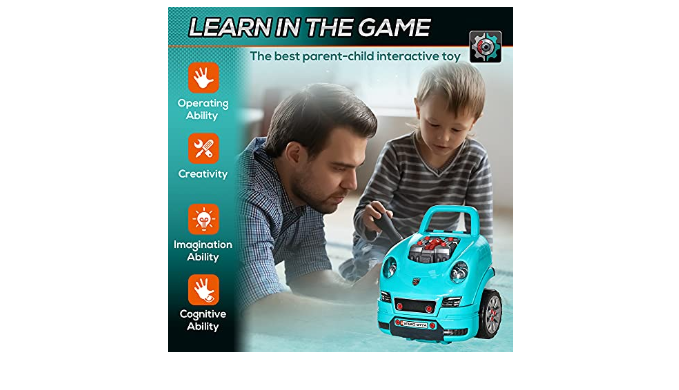 Like A Real Mechanic: By opening the engine cover, kids can explore the different parts of a car and learn how it works. It expands their imagination and vocabulary, letting them learn about auto repair tasks like replacing coolant, oil, spark plugs, batteries, wheels, rims, brake disks, and headlights.