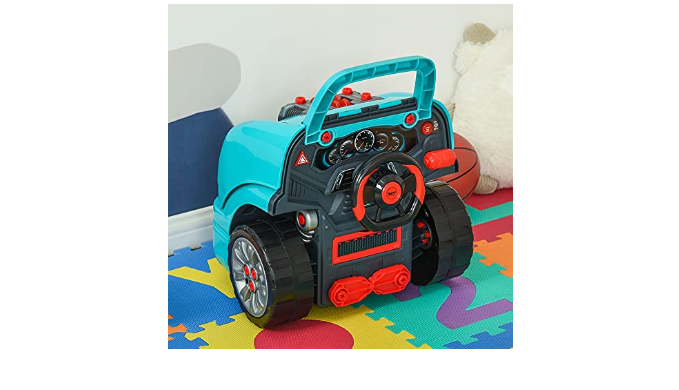 All Pieces Included: A total of 61 pieces are included in this engine repair toy set. This kid\'s engine toy consists of 28 bolts, four nuts, a key fob with a simulated lock, unlock, horn sound, and a DIY sticker set.