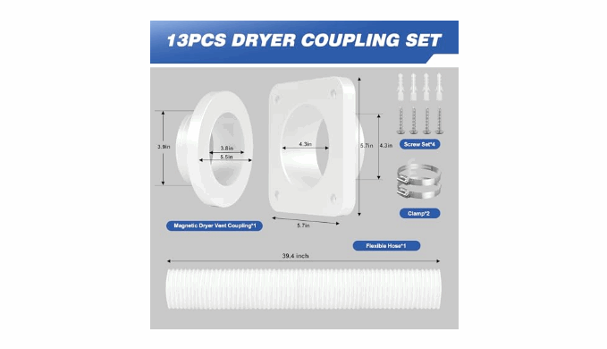 Package Included: Our magnetic dryer vent adaptor included wall assembly*1, dryer vent adapter*1, 4\" 3.3ft hose*1, clamps*2, wall anchors *4, screws*4. Please feel free to contact us if you have any problems~