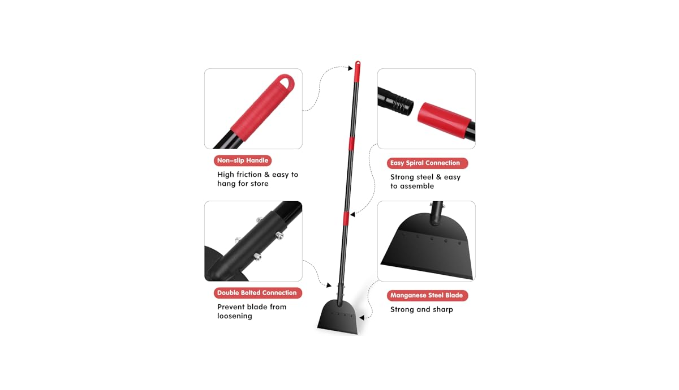 STURDY MATERIAL: The spade of the ice removal shovel is made of high-quality manganese steel, providing exceptional durability & impact resistance. The thickened stainless steel tubes are also heavy-duty and durable