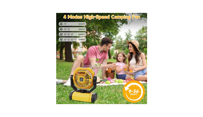 4 Speeds & 3 Lights Cordless Fan: Camping fan is designed with strong winds and camping Lantern. 4 speeds adjustable can meet your different needs in outdoor or indoor. 3 LED lantern modes can provide a portable light source for your night activities. The lowest brightness is suitable for night reading, the highest brightness can illuminate the entire tent.