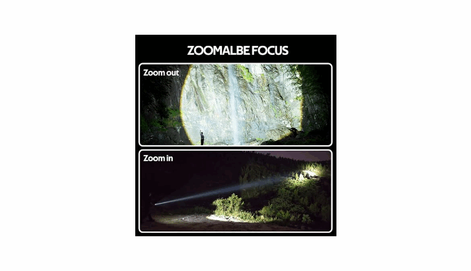 5 LIGHTING MODES AND ZOOMABLE: One button control of 5 lighting modes: OFF/High/Low/Strobe/SOS. Super bright flashlight has adjustable focus function as floodlight for wider area when zoom in or spotlight for longer distance when zoom out by stretching the top of the tactical flashlight.