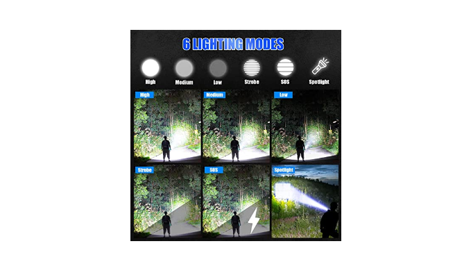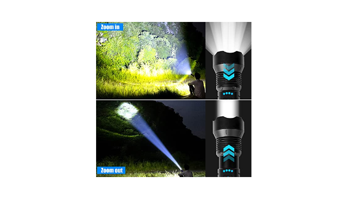 【100000 Brightest Flashlight】Rechargeable flashlights use a super light gathering XHP70 led wick, can generate up to 100000 lumens light output, maximum Irradiation distance is about 1640 feet. which is stable and super bright and provides incredibly powerful lighting. It is very suitable for camping, hiking or any outdoor activities and emergency power-off backup.