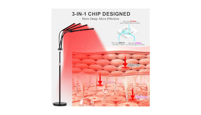 RED LIGHT THERAPY LAMP DEVICE: This product adopts a three-in-one chip design and is equipped with 180 LED lamp beads, each of which is composed of a combination of 660nm red light, 850nm and 940nm infrared light. The combination of three wavelengths performs focused red light therapy from multiple angles. Please note that this product is not a heating lamp