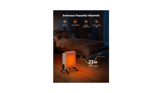 Embrace Peaceful Warmth: Ultra-quiet at just 23dB—quieter than a whisper—this fan-free indoor space heater keeps your space calm without stirring dust or drying the air. Ideal for work, relaxation, or sleep, it provides warmth without noise or irritants