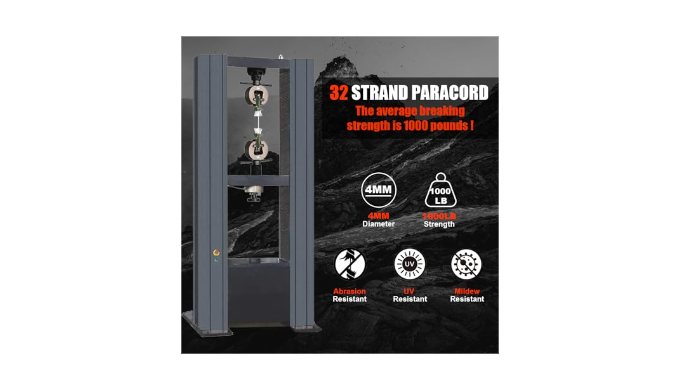 Paracord 1000LB: With an abrasion resistant 32 strand sheath structure and 12 strand inner-core 3-ply Inner Strands. The average breaking strength is 1000LBS. Compared with 750lb paracord rope, you can get an extra 250lb breaking strength for the same price. Thickness: 5/32-inches (about 4mm). And it is dependable, tough and long lasting.