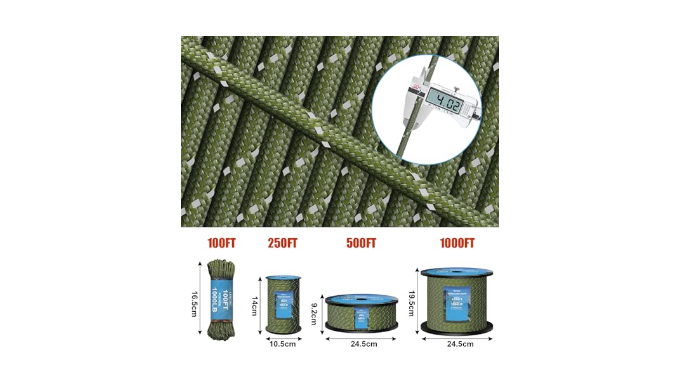 HIGH QUALITY: Our para cord is packaged to length. Our 250 feet and 500 feet and 1000 feet 1000 paracord include a reusable spool to facilitate your use and storage with out tangles. When illuminated by flashlights, lanterns or even moonlight, it has a reflective effect and is very eye-catching. At night, the ropes around the camping tent are carefree.