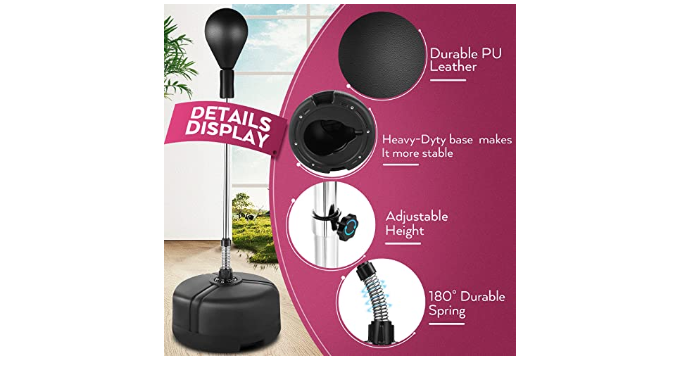 【Spring-mounted Boxing Ball】Our free standing boxing bag features a flexible spring at the base of the shaft which allows the punching bag to bounce back into position every time after every hit. This feature makes it a safe punching bag for people who quickly get used to this functional accessory