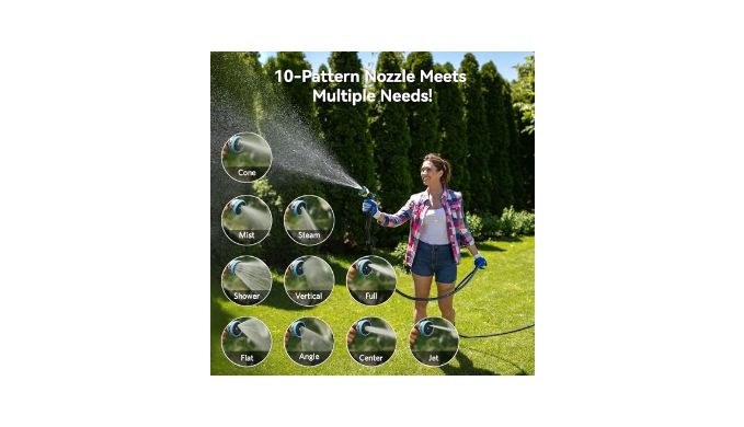 Quick Nozzle Change, Versatile Use: The garden hose reel has a water hose nozzle with 10 adjustable patterns, including angle, center, shower, full, steam, jet, mist, cone, vertical, and flat, to meet your various watering needs. It is ideal for car washing, watering, cleaning, pet bathing, etc