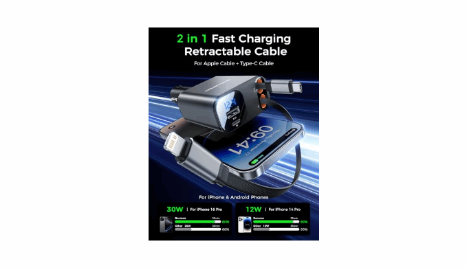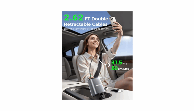 4 in 1 Retractable Car Charger: The Rocoren usb c cable car charger built-in 30W (Type-C cable) and 12W (For Apple cable) Dual Cable for iPhone and Android, ensures you never forget to bring the cable. The retractable cable extends up to 31.5 inches max(80 cm), long trips self driving, family travel, or daily commuting no longer require searching for messy cable packages, making it easier to pick up and use anytime, saving more time. Good choice for holiday gifts, not only can it gifts for men, but it can also be gifts for women. Retract operate: Pull and hold the cable, gently extend 1 cm more, then release, the cable will automatic retract