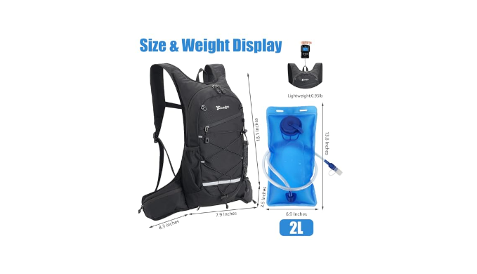 【Lightweight Hydration Pack Backpack】This backpack includes an 18-liter main compartment and a 2L food-grade hydration bladder. Made of wear-resistant polyester with splash resistance, it protects your items even in light rain. Weighing just 0.95 pounds, it reduces your load, making travel stress-free.