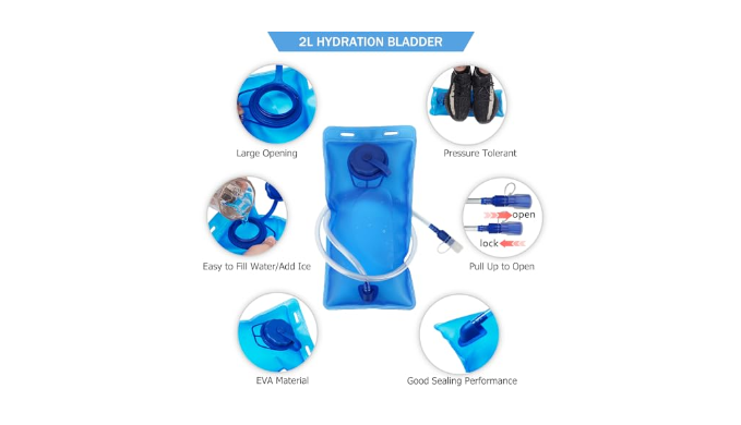 【Professional 2L Hydration Bladder】The 2L water bladder features a large opening for easy cleaning and ice addition. Made from food-grade EVA material, it has a strong seal to prevent leaks. The bite valve makes it easy to drink hands-free, helping you stay hydrated without needing an extra water bottle.