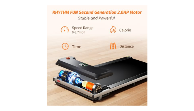 2.0HP brushless motor for quieter and smoother operation. Rhythm Fun Under Desk Treadmill adopts high-density closed sound insulation technology for stable and efficient operation, lower noise and longer service life, suitable for home office use.