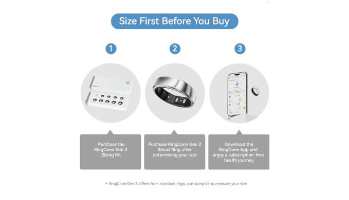 [Size Before You Buy] RingConn Gen 2 Smart Ring uses unique sizing standards, different from U.S. and other health rings. RingConn Gen 2 Sizing Kit helps you find the most comfortable and accurate fit for your finger, preventing the inconvenience of returns and exchanges by ensuring you select the correct size before purchasing