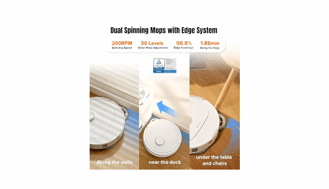 Unmatched Precision Cleaning: Introducing the Roborock Qrevo MaxV with FlexiArm Design Edge Mopping System. This innovative system reaches every corner and edge with 98.8% coverage and 1.85mm accuracy, ensuring no spot is missed. The 200 RPM dual rotation mop, combined with app-controlled water flow adjustment, delivers an unparalleled cleaning experience. Whether you\'re dealing with everyday dust or stubborn stains, this system makes achieving spotless floors effortless. Enjoy the convenience of high-precision cleaning technology that simplifies your daily chores and leaves your home gleaming.