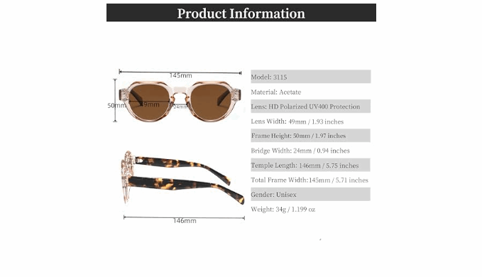 Premium Acetate Material for Durability & Comfort Crafted from high-quality acetate, these sunglasses offer a lightweight yet durable frame that is both flexible and comfortable, , providing long-lasting style and comfort for everyday wear.