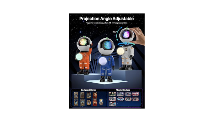 Unique Standing Astronaut with Moon Design: Featuring an innovative standing astronaut design, this astronaut projector offers full 360-degree rotation. The space themed LED lights for bedroom allow for easy adjustment of the nebula projection angle with its magnetic head connection. Additionally, the dimmable moon lamp and poseable arms add a stylish touch, making it not just a star projector galaxy light but also a decorative piece