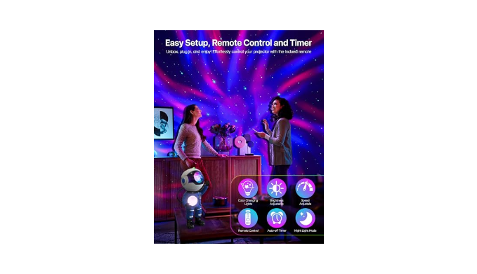 Remote Control & Auto-Off Timer: Easy setup, just unbox, plug in, and enjoy. Effortlessly control your night light projector with the included remote. Turn the galaxy lights, stars, or moonlight ON or OFF, switch lighting modes, change colors, and adjust brightness and speed. Set the timer to automatically turn off after 1 or 2 hours, so you can relax or fall asleep with peace of mind. Plus, the separate mesmerizing moon nightlight allows you to maintain a soft glow all night long if you prefer