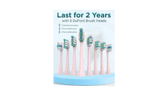 8 DuPont Upgraded Brush Heads - Included are 2 sensitive and 6 cleaning brush heads, all designed by the renowned DuPont, a global leader in quality and materials science. With recommended replacement every 3 months, these 8 heads will last about 2 years. The Rtauys electric toothbrush is crafted to fit the shape of your teeth and clean gums and hard-to-reach areas thoroughly.