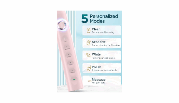5 High-Performance Brushing Modes- Rtauys sonic electric toothbrush has 5 modes. Clean: For daily cleaning; Sensitive: Softer cleaning for sensitive; Whitening: Remove surface stains; Polishing: 1-minute whitening teeth; Massage: For gum care. These modes accommodate different teeth and gum conditions, ensuring comprehensive cleaning and care.