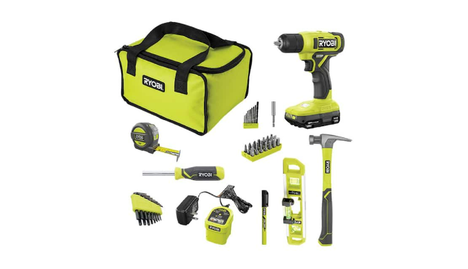 Includes: 18V ONE+ 3/8″ Drill, 18V ONE+ 1.5 Ah Battery, Charger, 16 oz. Fiberglass Hammer, 25′ Tape Measure, 2-in-1 Torpedo and Line Level, 1/4″ Bit Driver, (21) 1″ Impact Drive Bits, (10) Black Oxide Drill Bits, (16) Hex Keys, Bit Holder, Permanent Market, Tool Bag and Operator’s Manual