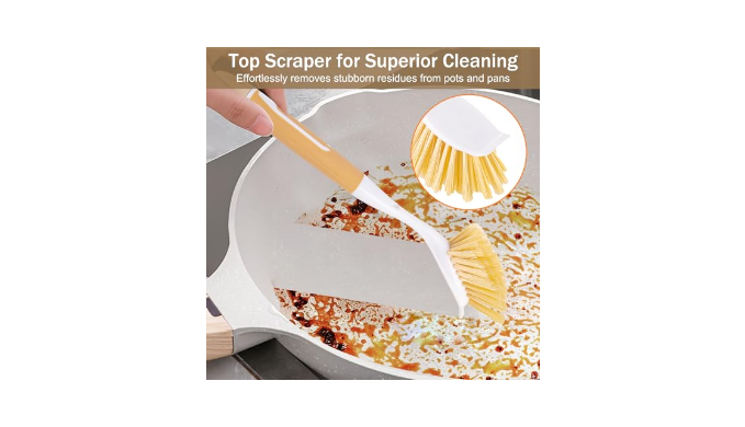 【Multifunctional Cleaning Brush 】Our premium dish brush with handle set is expertly crafted to fulfill all your cleaning needs – from washing dishes, pots, and pans to scrubbing stoves, countertops, sinks,and even bathtubs. The dense and medium-soft bristles nylon brush ensure effective cleaning without causing any surface damage.