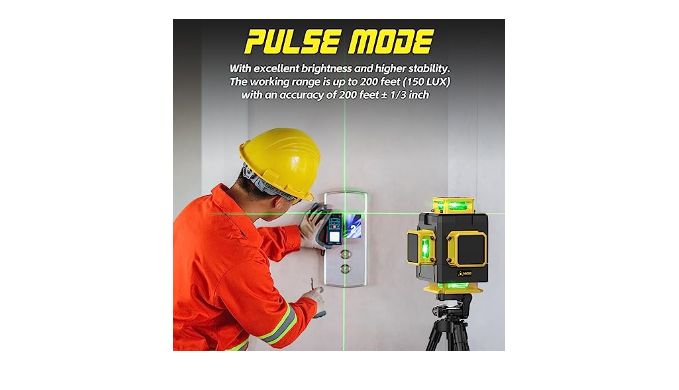 【Self-leveling Mode & Pulse Mode】The self-leveling mode can let you work normally when the tilt angle is more than ±4°, helping you to finish some work that needs to be done in the tilt angle otherwise laser level tool will beep to prompt you. When working normally indoors, the line laser level can receive 40m. After opening the pulse mode, you need to use with the receiver (not included). Your receiving distance is expanded to 200ft which will provide greater help for your measurement.