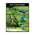 Versatile 3-IN-1 Tool Design & Multi-Function Capability: Switch effortlessly between functions with our 12\" cordless push mower that transforms into a string trimmer and wheeled edger with just one twist. This innovative lawn trimmer delivers precise edging, detailed trimming, and efficient mowing – all from a single tool. Save money and storage space while achieving professional-looking results across your entire yard